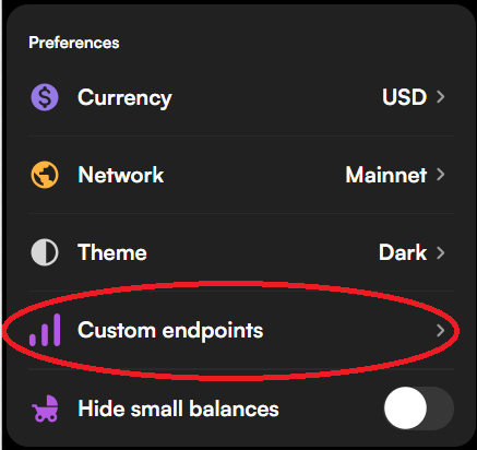 To add this RPC on Compass Wallet, click on the burger menu in the top left, then select Custom Endpoints.