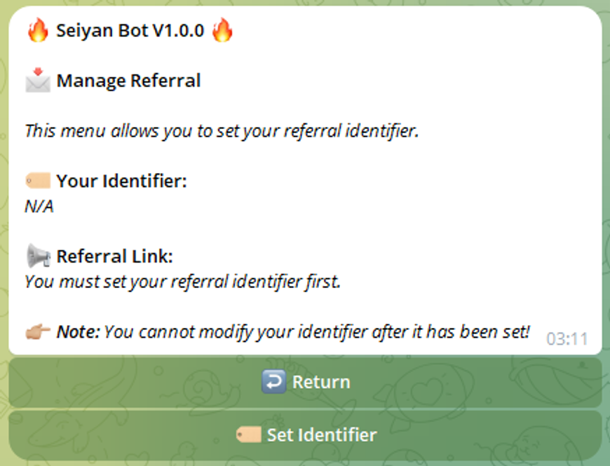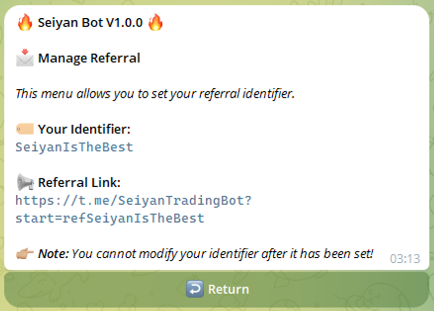Your referral identifier must be unique and once you set it — there’s no changing it, so make sure you select the right one! Click on ‘Set Identifier’ to get started and confirm your selection to set up your referral link.